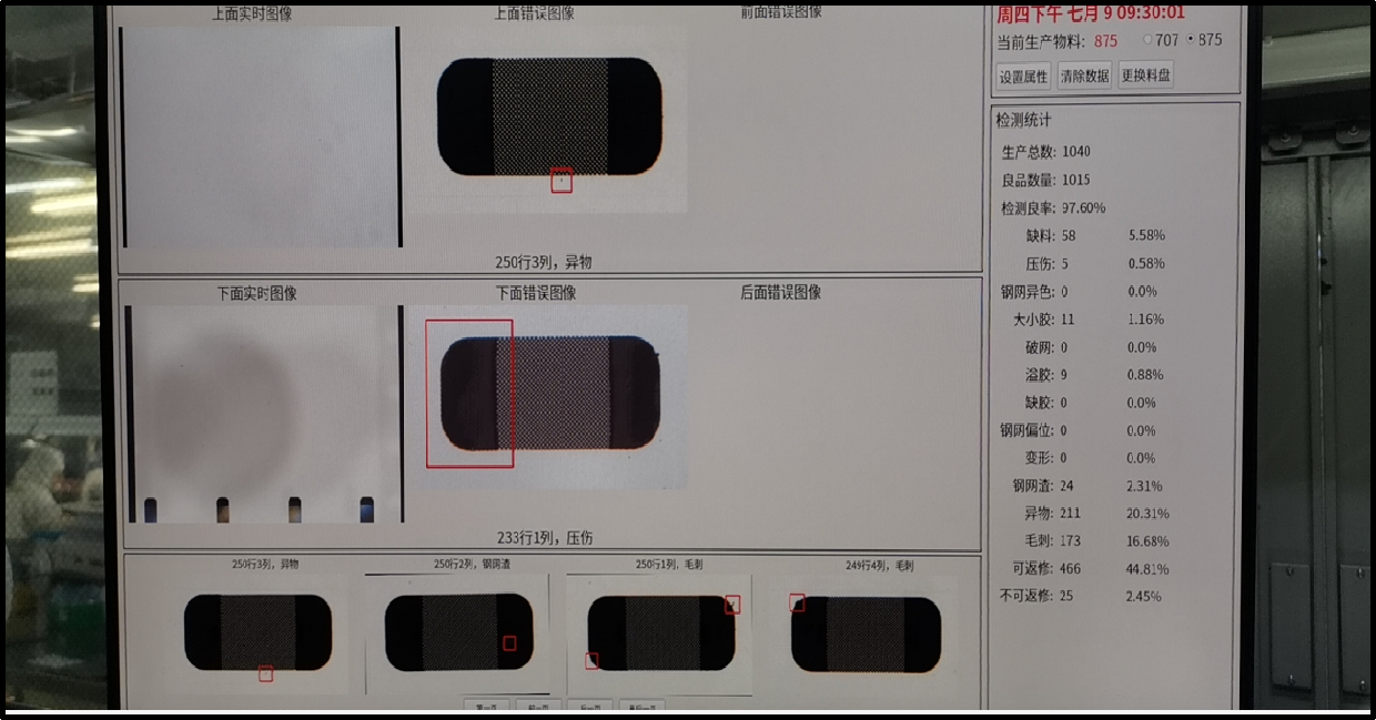 Currently, the system covers dozens of defect types, such as: steel mesh hull deformation, bending deformation, foreign object, clamping waste, burr, hull mesh breaking, wire mesh separation, steel mesh offset position, steel mesh deformation, steel mesh slag, wavy edges, large and small edges, liner offset position, liner more product, leaky white, peeling glue, lack of glue, overflow glue, glue offset position, and so on.