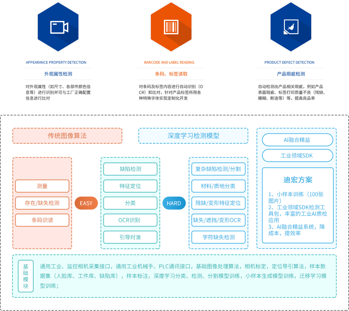 中科迪宏“基于AI的标签动态检测系统”,以基于AI视觉的深度神经网络算法模型为核心,结合外观检测、条码读取、标签内容识别及瑕疵检测等模块,组成一套完整的多功能智能集成系统,可快速完成定制化开发,本地化部署,有效解决上述问题。