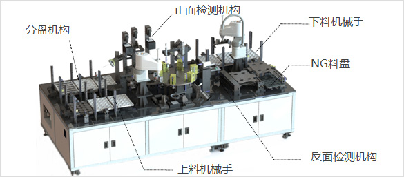 Adopting an optical-mechanical integration solution, machine vision replaces the human eye and deep learning is used to automatically detect defects in product appearance, which can achieve automatic loading of qualified products and automatic sorting of NG products.